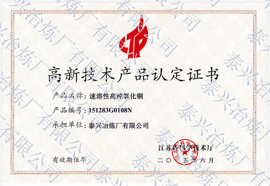 自主研發的空氣二次氣提生產高純堿式碳酸銅,填補國內空白,獲得泰州市科技進步二等獎